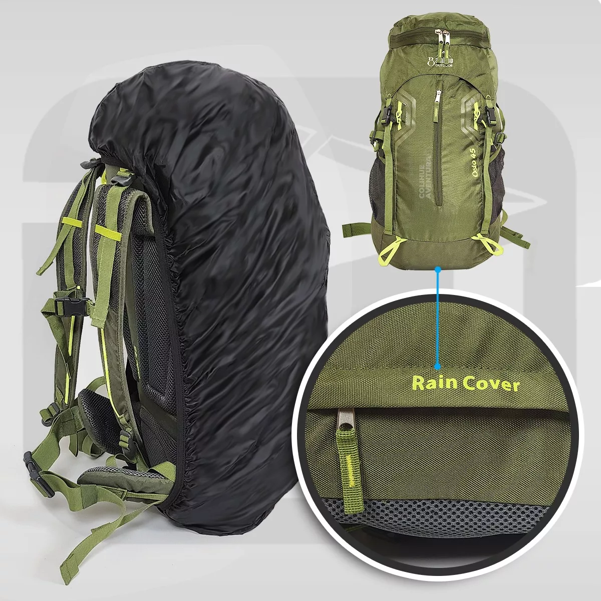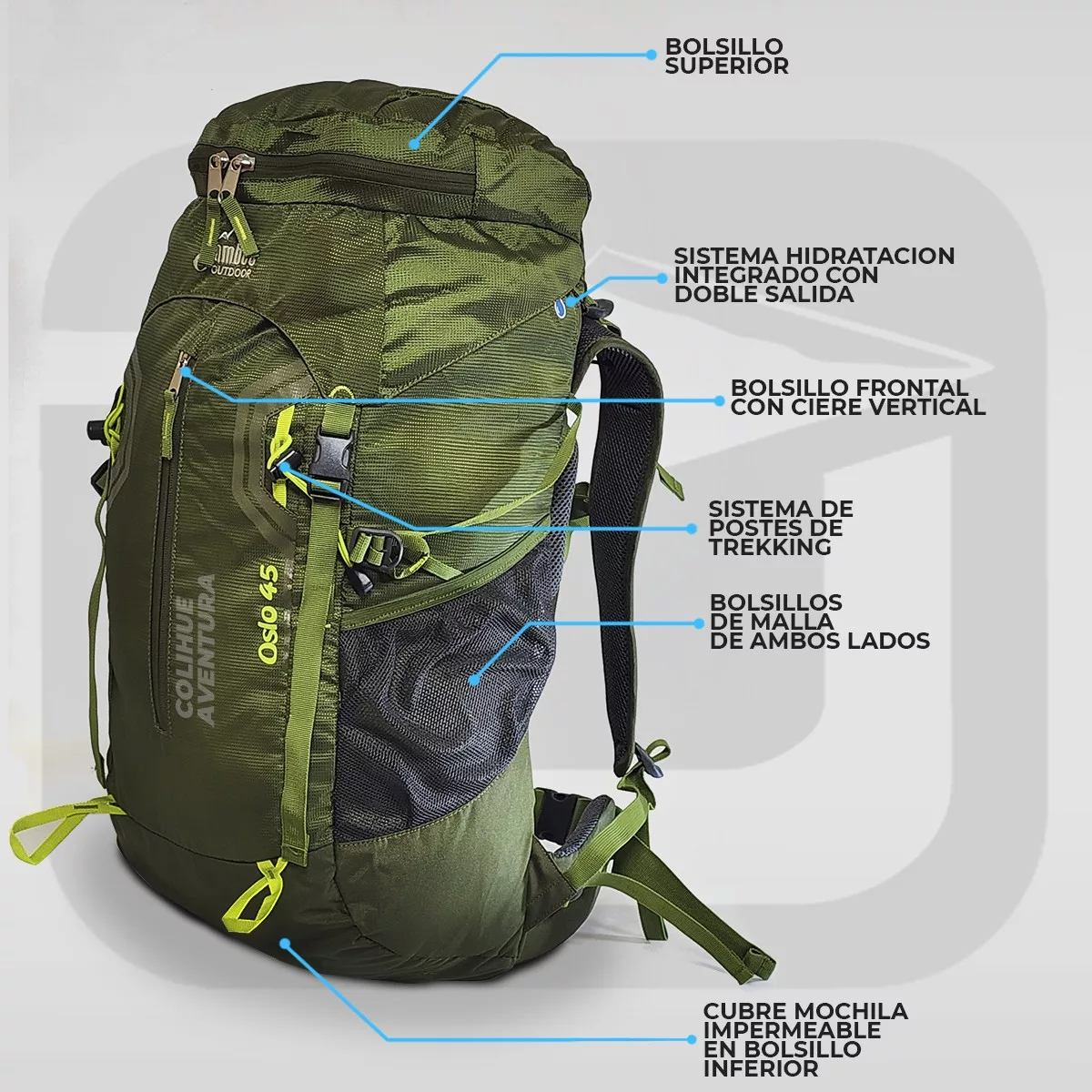 Posee un compartimiento principal con gran apertura en forma de U. Ajuste para bastones de trekking , bolsillo con cierre en el cinturón, Compatible con bolsa de Hidratación, tiene cubremochila oculto en un bolsillo inferior, que no solo se usa para protegerla de la lluvia, sino para cuidarlas cuando se despachan en micro o avión, de esta forma no se manchan por el manipuleo y roce en las bodegas.